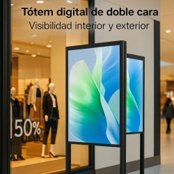 El tòtem digital Xoroi de doble cara està dissenyat per a aparadors dʻalt impacte visual, amb una pantalla exterior ultra brillant de 2500nits i una cara interior de 500nits. La seva estructura prima, elegant i robusta el converteix en una solució perfecta per a senyalització digital a botigues i espais comercials. Funciona 24/7, inclou sistema Android i permet reproduir vídeos, imatges i so des de múltiples formats.