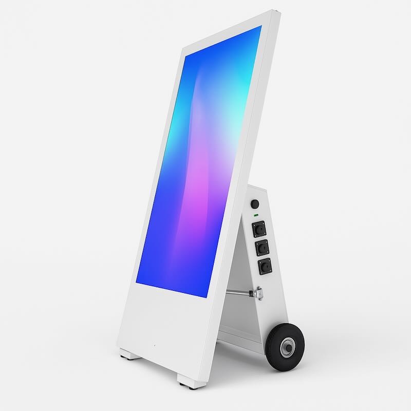 Tòtem publicitari portàtil per a exterior amb bateria integrada i rodes. Pantalla LCD de 43 "Full HD d'alta brillantor, resistent a l'aigua i la pols (IP65). Funciona sense cables durant més de 15 hores. Ideal per a esdeveniments, promocions i punts de venda mòbils."