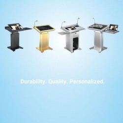 Para la movilidad y la estabilidad sólida del atril durante la presentación, se han incorporado 4 ruedas laterales en la placa inferior. Además, podemos personalizar su atril con un logotipo o mensaje en la parte frontal.